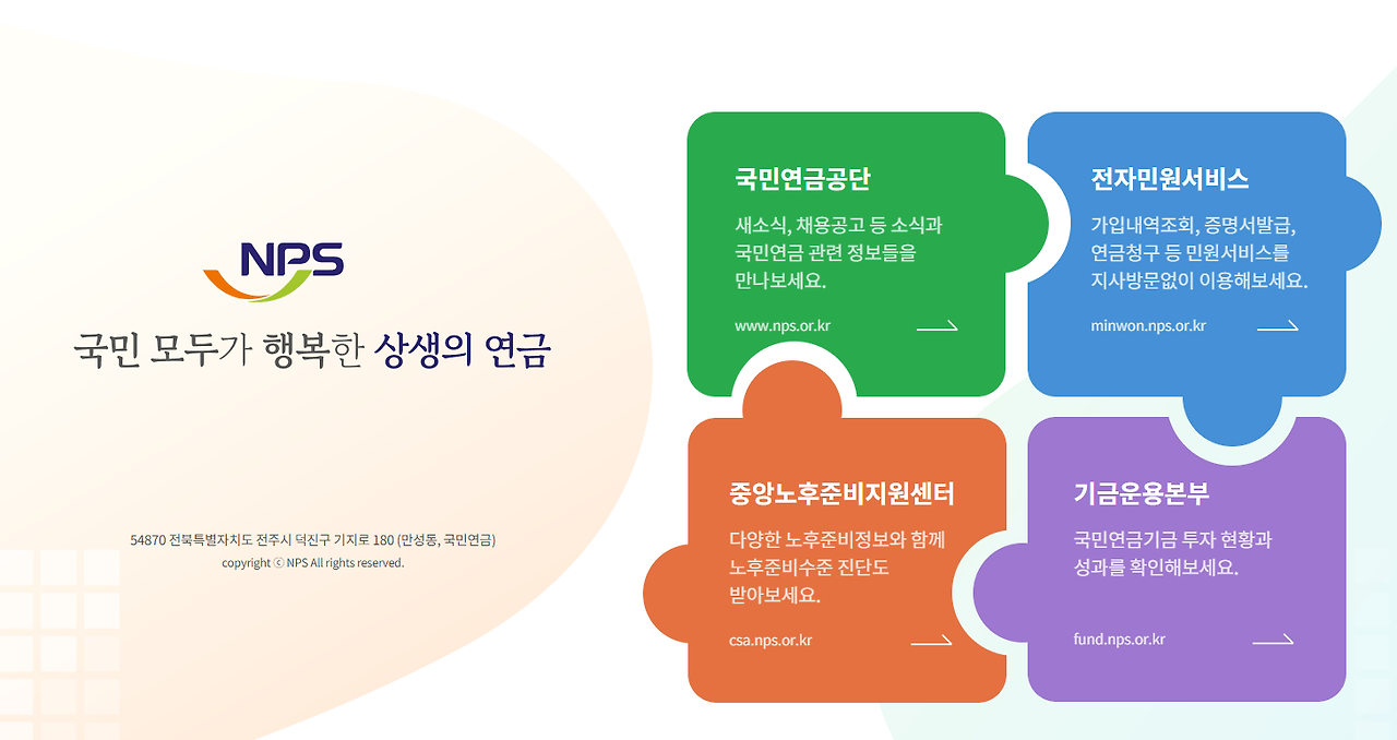 국민연금관리공단 홈페이지 메인에는 새소식, 채용공고 등의 소식과 국민연금 관련 정보를 확인할 수 있는 국민연금공단, 가입내역조회, 증명서발금, 연금청구 등 민원 서비스를 지사를 방문하지 않고 이용할 수 있는 전자민원서비스, 다양한 노후준비정보와 함께 노후준비수준 진단을 받아볼 수 있는 중앙노후준비지원센터, 국민연금기금 투자 현황과 성과를 확이할 수 있는 기금운용본부 네가지 카테고리로 나뉘어져 있습니다. 지금 바로 홈페이지에 방문해서 확인해 보세요.