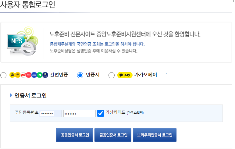 국민연금 납입내역 조회할 때와 같이 공인인증서로 로그인합니다. 로그인 후에 받을 수 있는 연도와 금액을 확인하실 수 있습니다.
