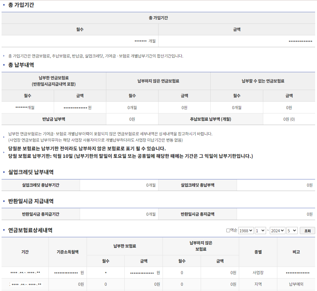 4. 총 납부내역에서는 전체 납부한 개월수와 금액을 확인하실수 있으며 납부하지 않은 연금보험료, 납부할 수 없는 연급보험료를 확인하실 수 있으며, 실업크레딧 납부내역이 있다면 이 내용도 확인가능합니다. 마지막으로 연금보험료 상세내역도 확인할 수 있습니다.