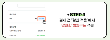 캠핑장 예약 시 1만 원 할인 쿠폰을 선착순으로 제공하며 쿠폰 사용 및 이용완료 고객 대상 경품을 추첨을 통해 총 33명에게 제공하는 이벤트도 있으니 도전해 보세요!
