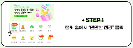 만만한 캠핑 할인쿠폰 다운로드합니다. 할인 대상 만만한 캠핑장 확인합니다. 캠핑장 등록여부 확인합니다. 결제창 할인쿠폰을 선택합니다. 안전하고 행복한 캠핑 즐깁니다.