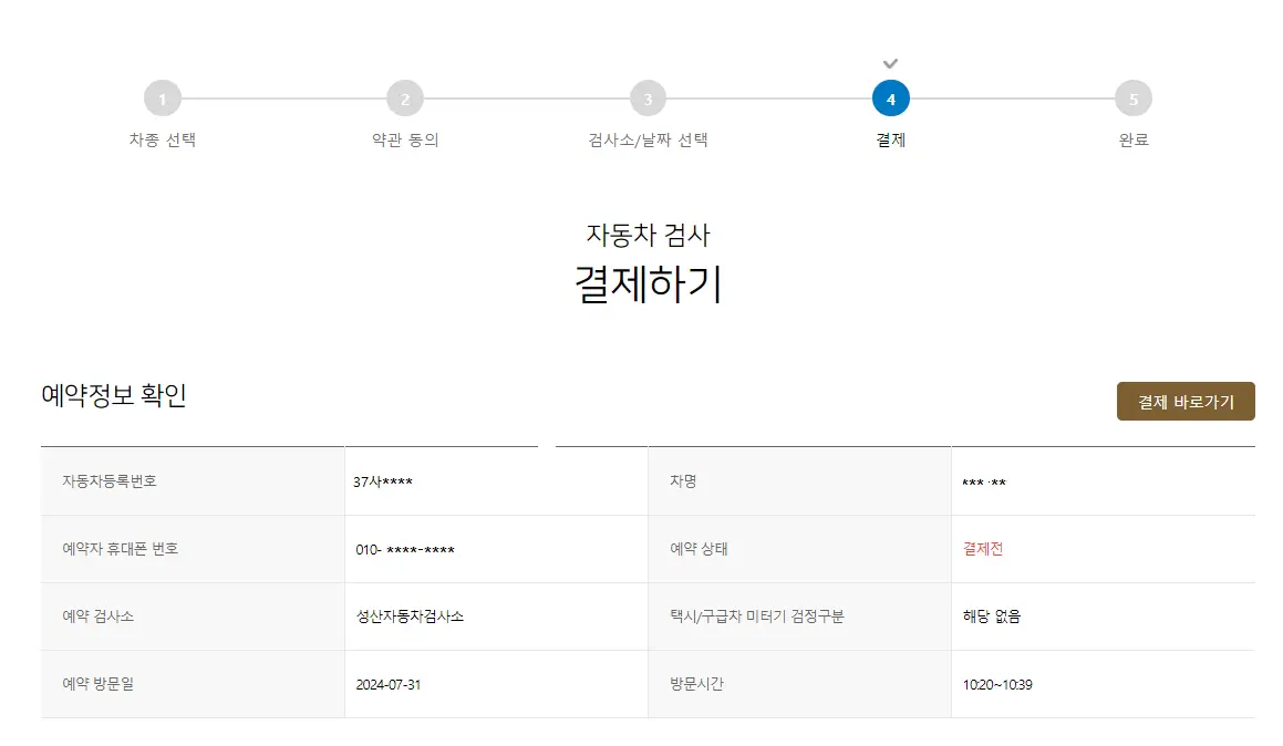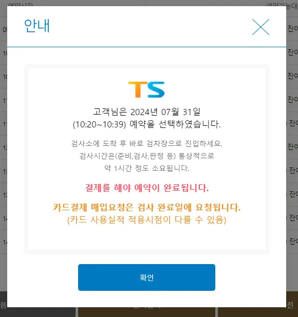 검사 날짜, 검사소, 검사 시간을 모두 선택하면 예약안내문이 나오고 결제를 해야 예약이 완료된다는 안내가 나옵니다.