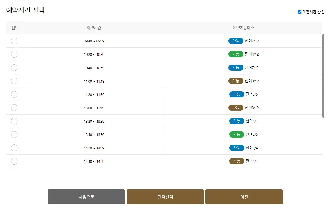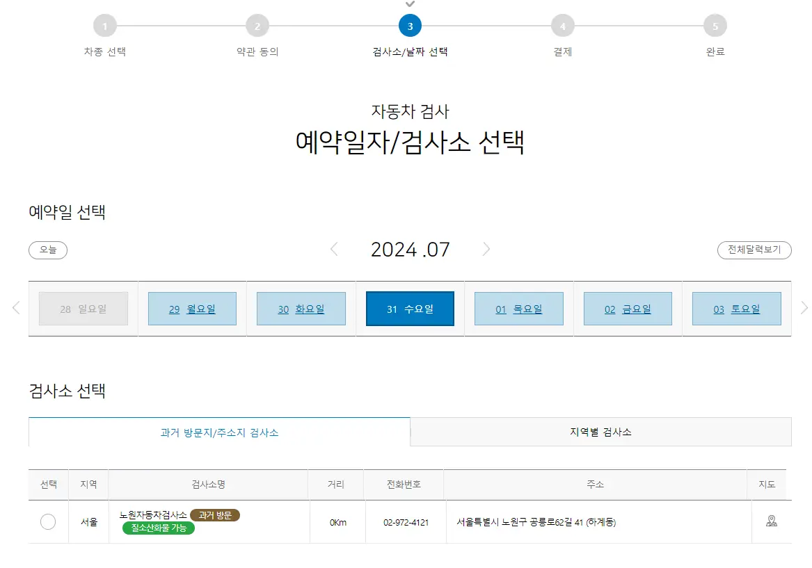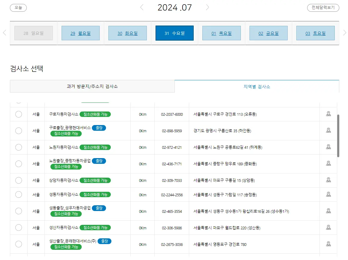 지역별 검사소를 클릭하면 원하는 검사소를 선택할 수 있고, 검사소를 선택하면 예약시간을 선택할 수 있습니다.