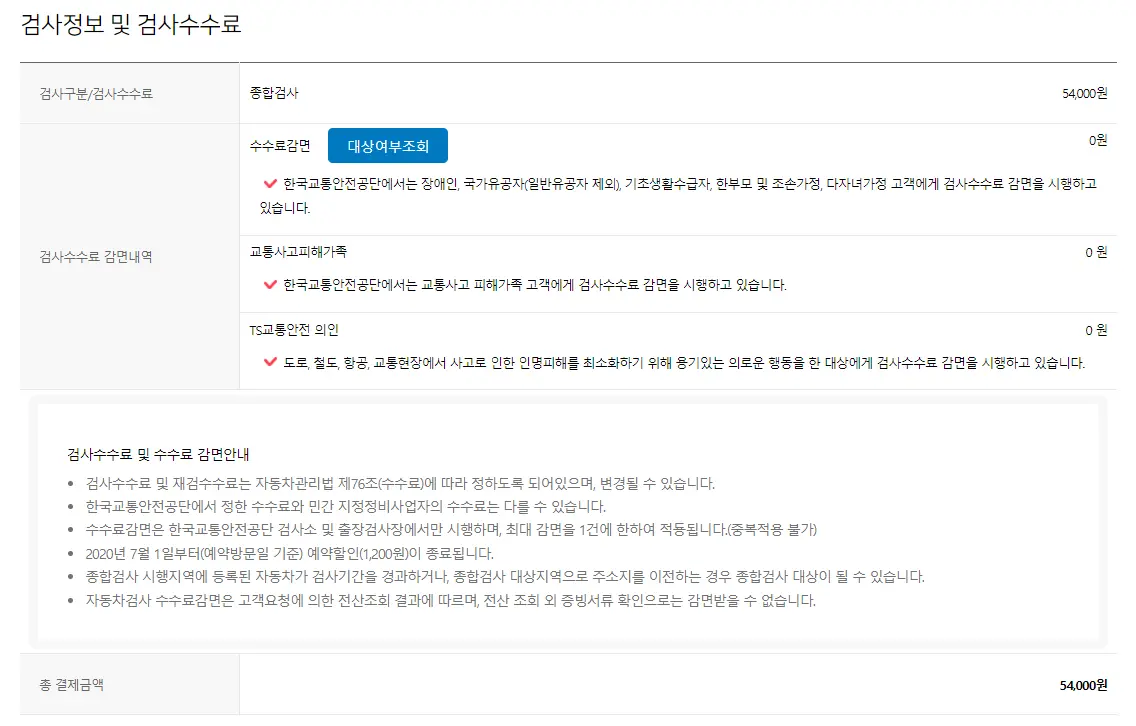 검사 정보 및 검사 수수료에 대한 감면 내역을 확인하실 수 있습니다.