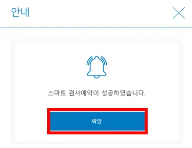 결제가 완료되면 스마트 검사예약이 성공하였다는 안내와 검사 예약이 완료됩니다.