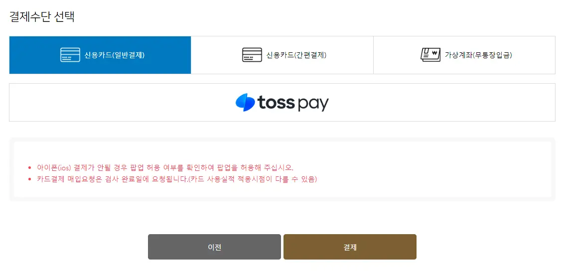 결제 수단을 선택하고 결제를 진행합니다. 신용카드로 결제하거나 가상계좌를 통해 무통장입금하여 결제를 완료할 수 있습니다.