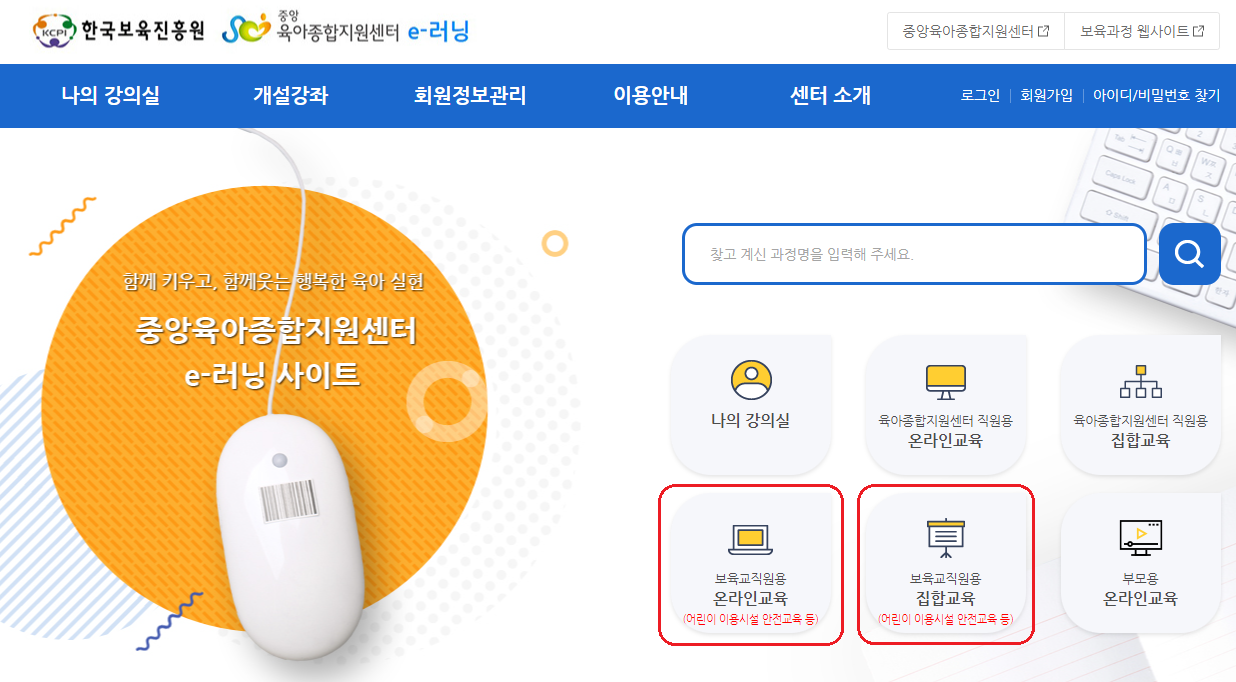 한국보육진흥원 중앙육아종합지원센터 e-러닝 홈페이지에 접속합니다. 보육교직원용 온라인 교육과 보육직원용 집합교육을 선택하실 수 있습니다.